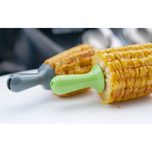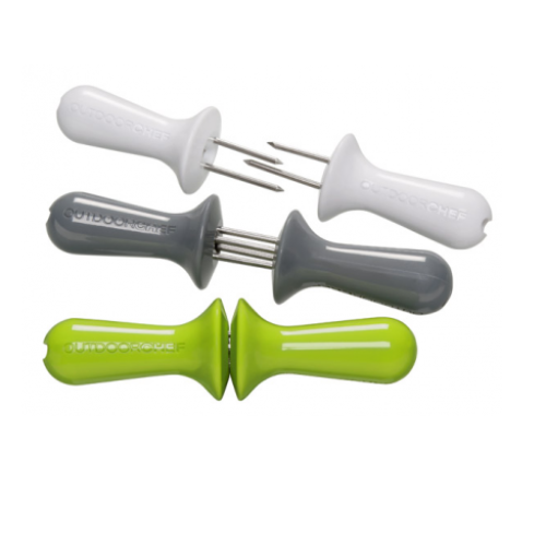 Jak jíst grilovanou kukuřici s elegancí a bez spálených konečků prstů? Držáky v OUTDOORCHEF barvách s chytrým blokovacím mechanismem pro bezpečné skladování zapíchnete z boku do ogrilované kukuřice. Odolné hroty jsou vyrobeny z nerezové oceli.