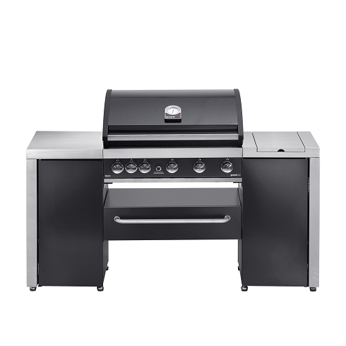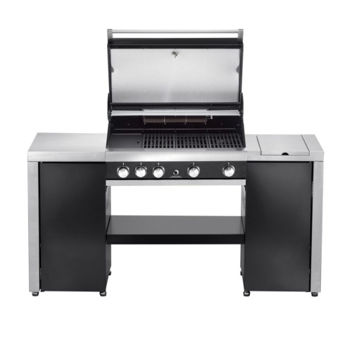 Atraktivní gril, který bude dominantou vaší zahrady a každé zahradní párty. Kvalitní grilovací centrum přesvědčí nejen velkým výkonem, ale i výbavou a odpovídajícím designem. Využijte velký výkon pěti hlavních hořáků nebo zadního infračerveného hořáku pro pomalé opékání pokrmů na otočném rožni. Boční hořák zapuštěný do pravé police obstará přípravu omáček a příloh ke grilovaným pokrmům. Hořáky se uvádějí v chod elektronickým zapalováním. Regulací každého hořáku lze dosáhnout celkového výkonu 17,5 kW. Atraktivní řešení Island se dvěmi skříňkami na stranách grilu nabízí dostatek úložného prostoru, který umocní pevná police ve spodní části.