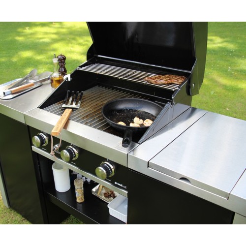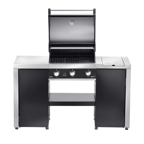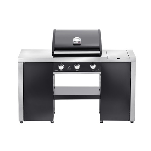 Kvalitní gril se třemi výkonnými hořáky, které umožní docílit vynikající grilovací výsledky. Hořáky se uvádějí v chod elektronickým zapalováním. Regulací každého hořáku lze dosáhnout celkového výkonu 12,6 kW. Boční hořák zapuštěný do pravé police je určen pro přípravu příloh nebo omáček v hrnci nebo na pánvi. Atraktivní řešení Island se dvěmi skříňkami na stranách grilu nabízí dostatek úložného prostoru, který umocní pevná police ve spodní části.