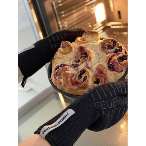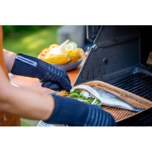 Kevlarové grilovací rukavice BBQ Premium představují již druhou generaci produktů značky FEUERMEISTER®. Tepluodolná rukavice se vyznačuje kvalitním zpracováním a dvojím bezešvým pletením. Vnější prodyšná část rukavice je vyrobena z černých žáruvzdorných aramidových vláken Nomex. Pro maximální komfort je vnitřní část rukavice vyrobena z vlny (80%) a polyesteru (20%). Pro jistý a neklouzající úchop je rukavice na obou stranách opatřena aplikací z velmi kvalitního žáruvzdorného silikonu s vyobrazením loga výrobce ve střední části a výraznou nášivkou FEUERMEISTER® coby pečetí kvality. Oboustranná aplikace silikonu poskytuje možnost použití rukavice na pravé i levé ruce. Ani přes opakované použití a praní rukavice neztratí nic ze svého tvaru a dlouhodobé trvanlivosti. Rukavice je dostatečně dlouhá, aby ochránila předloktí před žárem a poletujícími jiskrami. Tyto pracovní kevlarové rukavice najdou uplatnění všude, kde je zapotřebí manipulovat s horkými předměty či materiálem nebo se pohybovat poblíž zdroje tepla.