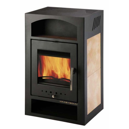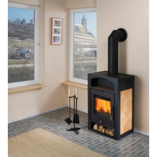 Krbová kamna Adria mini II jsou díky své kompaktní velikosti vhodná i do menších prostor. Korpus ve stylové černé barvě doplňuje béžová dlažba na bocích.