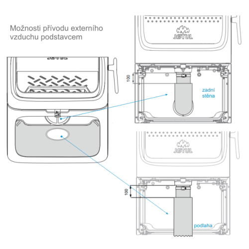 Model Jøtul F 305 B stojí na praktickém podstavci, který lze používat pro ukládání dřeva. Za velkými prosklenými dvířky je ukrytý praktický popelník.