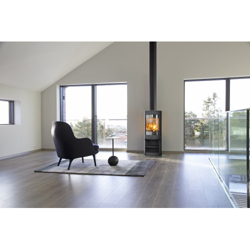 Jøtul F 371 stojí na stabilním podstavci s praktickým úložným prostorem.