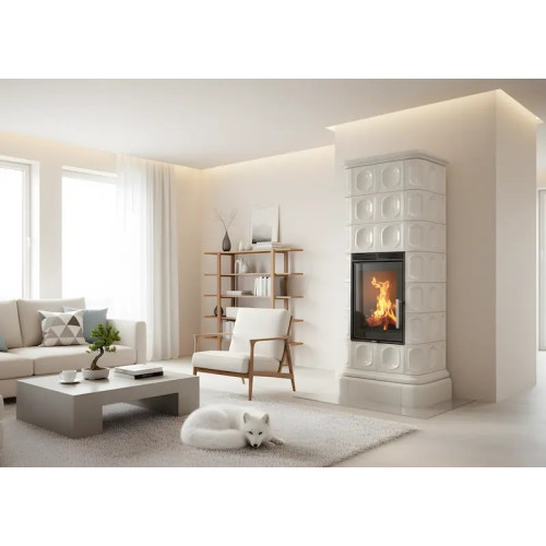 - Kachlová kamna moderního designu s litinovým čelem a celoskleněnými dvířky svou výškou vhodně doplňují prostory s vysokým stropem.