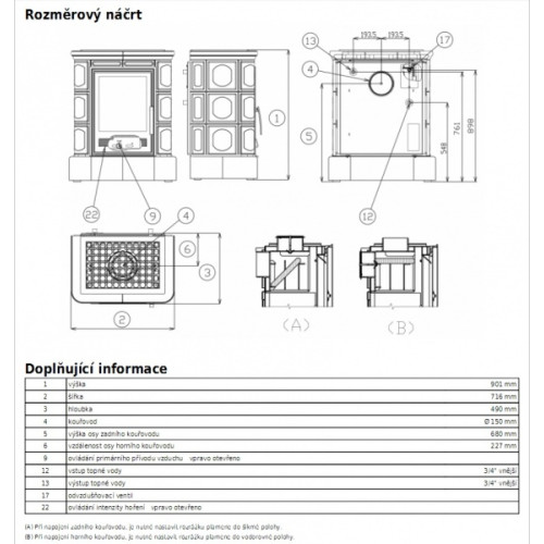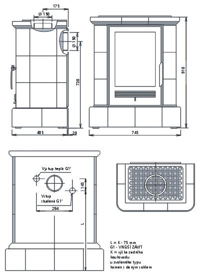 - Kachlová kamna klasického designu s litinovým čelem a dvířky s teplovodním výměníkem 6,9kW.