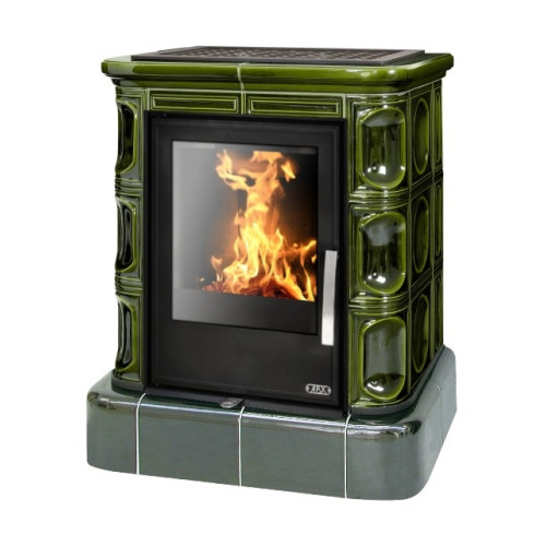 Kachlová kamna ABX Marina s výměníkem, černý korpus, kachlový sokl, opláštění kachle zelená