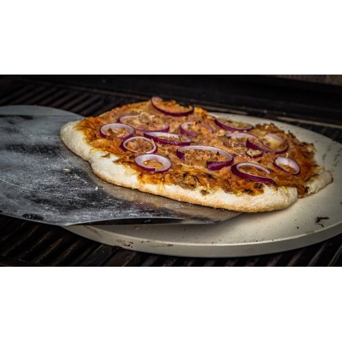 Grilovací kámen na pizzu GrandHall je vhodný pro přípravu nejen pizzy, ale i chleba, různých placek, koláčů, palačinek nebo lívanců. Speciální porézní kámen dodá grilované pizze vláčnost s křupavou krustou. Pizza kámen položte na grilovací rošt a pizu na něj. Budete velmi překvapeni jak lahodná je pizza z grilu. Kámen lze mýt pouze ručně. Plech má přizvedlé okraje pro snadnou manipulaci. Součástí dodávky je kráječ z nerezi pro snadné porcování pizzy.