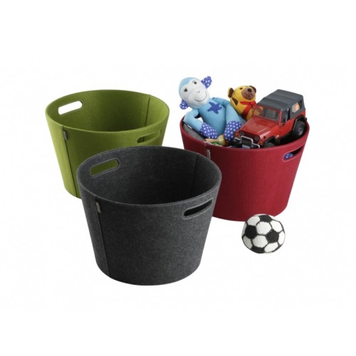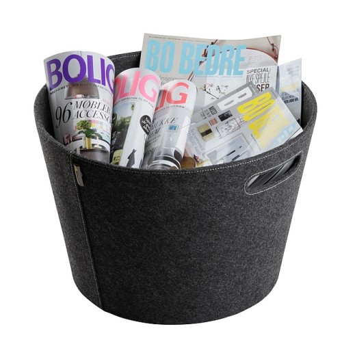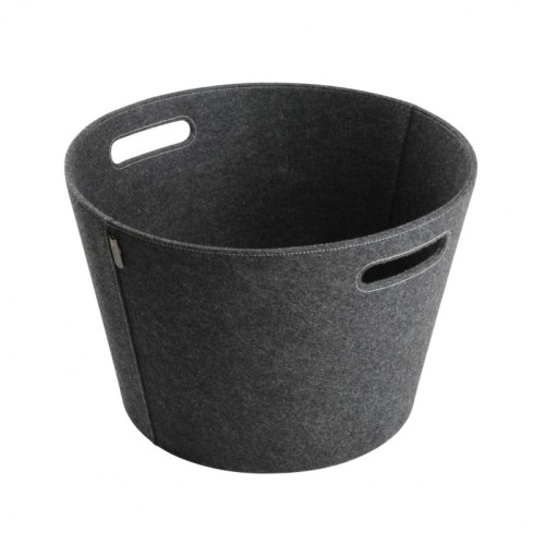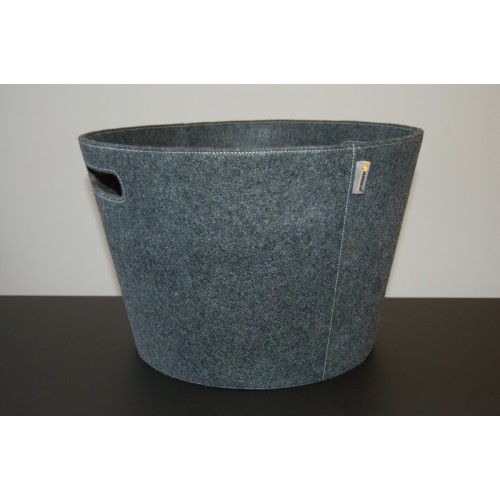 Interiérový koš potažený tmavě šedou plsťovou látkou s bílým prošíváním, Ø 45 cm, výška 29,5 cm.