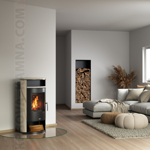 Krbová kamna ABX Island 7 Aqua s TV černý korpus, opláštění pískovec, včetně horní desky.