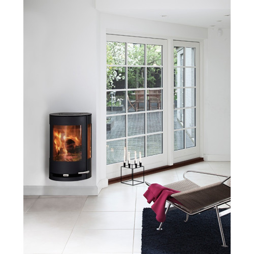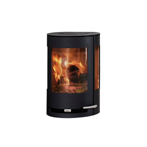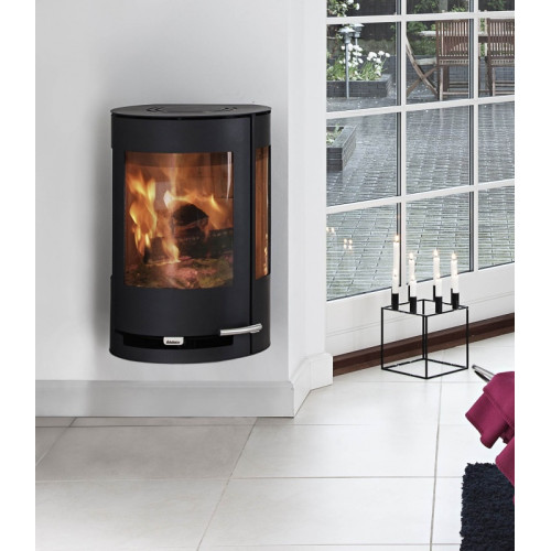 Závěsná kulatá konvekční krbová kamna Aduro 9.4 s bočním prosklením – minimum pro maximum. Kamna mají na obou stranách spalovací komory velké prosklené otvory, které zajišťují maximální možnost pohledu na krásnou hru plamenů doslova ze všech stran a při tom pomalu zcela zaniká tělo kamen a převažuje živý oheň uzavřený za sklem. Oba boční skleněné průzory mají své vlastní oplachy (sklo dvířek samozřejmě také), které zajišťují maximální možnou čistotu obou bočních skel a jsou podle potřeby regulovatelné.