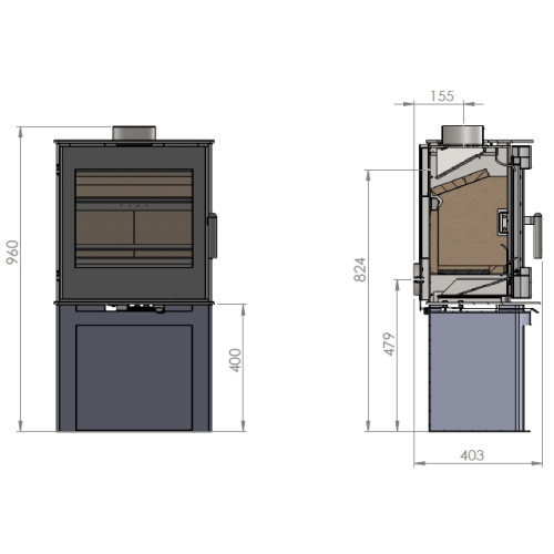 Široká spalovací komora umožňuje pohodlné přikládání polen dlouhých až 38 cm a centrální přívod vzduchu umožňuje napojení na vzduch z exteriéru. Další výhoda je prostorný dřevník na uložení paliva.