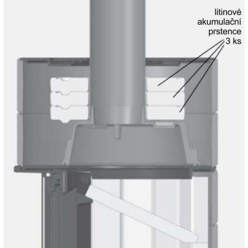 Dno spalovací komory je z velmi odolného šamotu a zbytek vyzdívky z izolačního vermikulitu, který zlepšuje hoření, perfektně izoluje a ochraňuje spalovací komoru kamen.