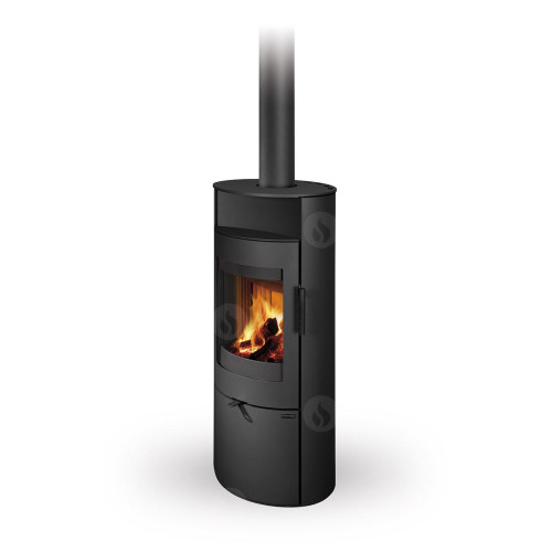 Oválný tvar krbových kamen LUGO N působí v interiéru útulným dojmem. Příjemnými detaily jsou například odkládací parapet nad ohništěm nebo klika dvířek, která svým technickým řešením i designem dává krbovým kamnům elegantní vzhled.