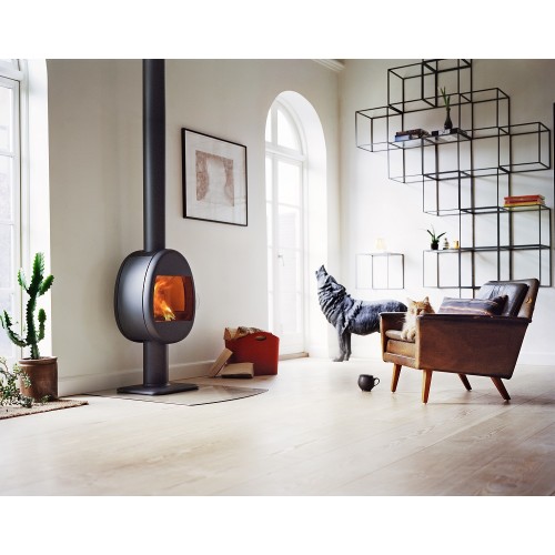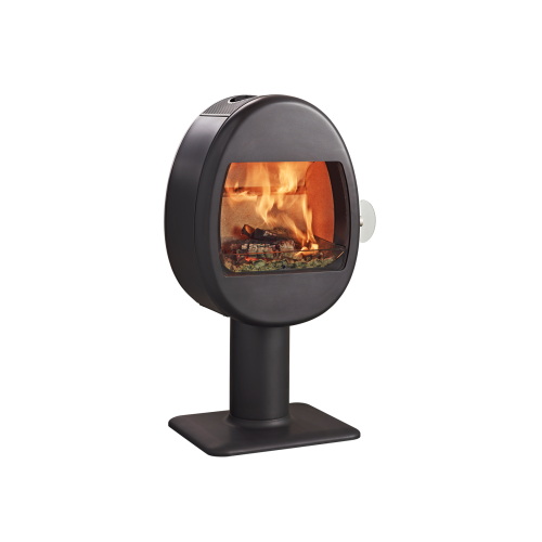 Scan 66–2 černý lak stojí na elegantní noze. Externí vzduch lze přivést přímo do topeniště kanálem skrytým uvnitř podstavce.