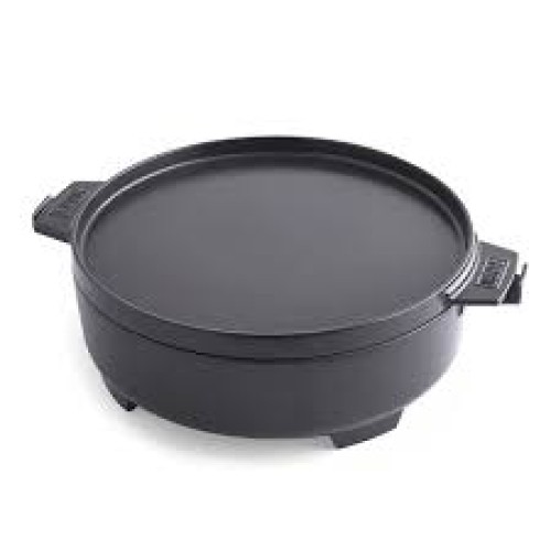 Toto univerzální nádobí poskytuje nekonečné možnosti během grilování. Litinový hrnec s objemem 6,8 litru zajišťuje rovnoměrné rozložení a zadržení tepla při přípravě jemné pečeně, chutných polévek a šťavnatého ragú. Dvoufunkční poklička slouží také jako pánev k opečení sendvičů či k dokonalé přípravě kuřecích prsíček a zeleniny. Porcelánem smaltovaný povrch usnadňuje čištění a hrnec i poklička do sebe dobře zapadají a šetři místo během skladování.