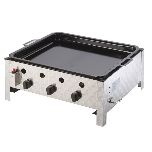 Broušená nerez, termopojistka, piezo, 3 hořáky. Příslušenství pro připojení k 5 kg a 10 kg lahvi + smaltovaná pánev je v ceně.