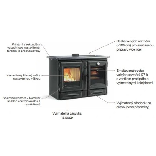Smaltovaná trouba velkých rozměrů (78 l) s ventilem proti páře a vyjímatelnými kolejnicemi