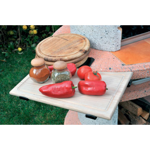 Polička z bukového dřeva včetně ocelového držáku a svorky k uchycení na obloukovou pracovní desku krbu 7-9 cm silnou.