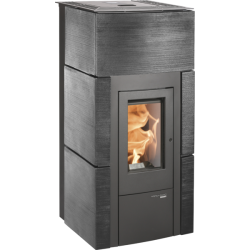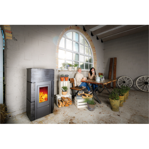 Peletovým kamnům HSP 6 RUEDA sluší beton, klidné barvy a jednoduchost. Keramický obklad s ručně škrábanou texturou matného kovu perfektně zapadne do minimalistického interiéru. Nově je možné zvolit i variantu bílé kachle nebo zrzavé patiny. Věděli jste, že kachle mohou mít i 3D potisk? Přesně tak tomu je v případě zrzavé patiny.