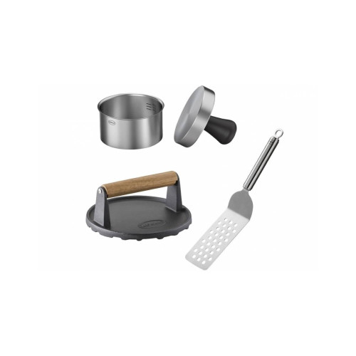 Sada obsahuje: lis na hamburgery, obracečku a záváží na grilování.