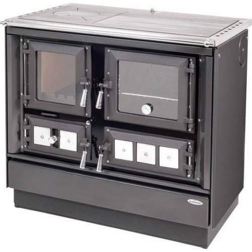 Sporák na pevná paliva antracit, pravý, chromované doplňky, nerezový rám plotny, ocelová broušená plotna