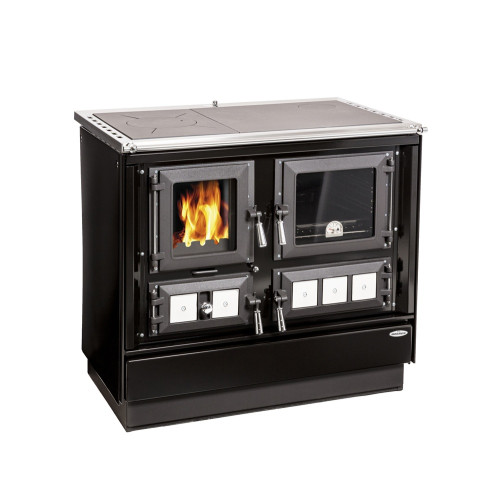 Sporák na pevná paliva černý pravý, chromované doplňky, smaltovaný černý rám plotny, ocelová stříkaná plotna dělená