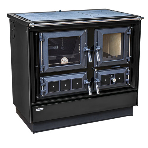 Sporák na pevná paliva černý levý, chromované doplňky, smaltovaný černý rám plotny, ocelová stříkaná plotna dělená