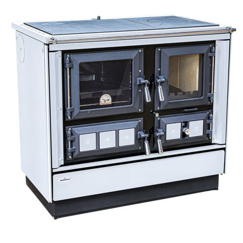 Sporák na pevná paliva světle šedý levý, chromované doplňky, smaltovaný rám plotny, ocelová broušená plotna