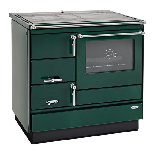 Sporák na pevná paliva zelený pravý, chromované doplňky, ocelová broušená plotna, smaltovaný zelený rám plotny