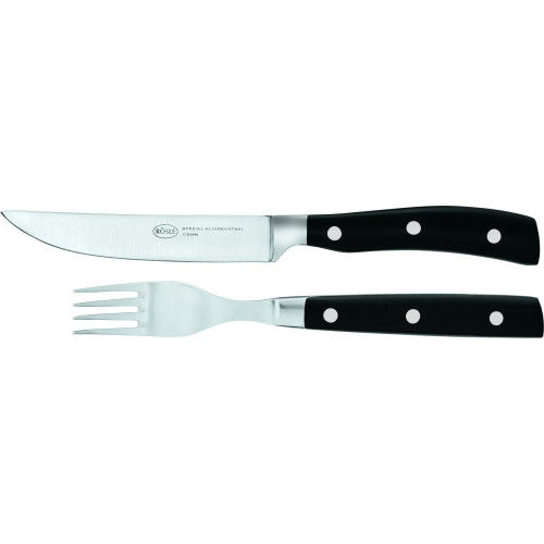 Vychutnejte si steak se stylovým steakovým příborem. Příbory jsou vyrobeny z kvalitní nerezové oceli a nýtované plastové rukojeti zajišťují příjemné uchopení. Odolné příbory vás budou při servírování grilovaných dobrot doprovázet dlouhá léta a přijdou vhod při každé hostině. Dřevěná krabička obsahuje 2 ks vidliček a 2 ks nožů. Příbory lze mýt v myčce na nádobí.