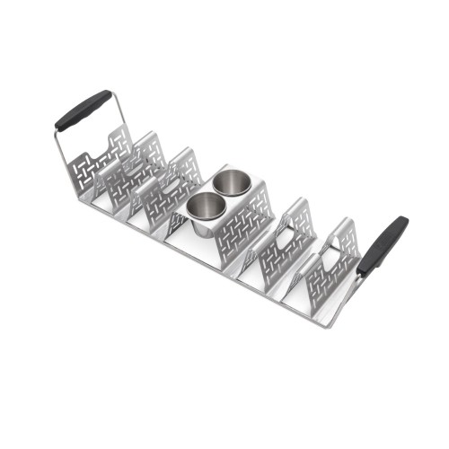 Stojan na tacos Weber je praktickým a stylovým doplňkem, který vám umožní připravit dokonalé tacos přímo na grilu. Tento inovativní stojan je navržen tak, aby vaše tacos zůstaly teplé a křupavé až do posledního sousta. Stojan je navržen tak, aby se na něj vešlo až 6 ks tacos současně, což je ideální pro grilování pro větší skupinu lidí. Je vyroben z nerezové oceli, což zaručuje dlouhou životnost a odolnost vůči vysokým teplotám, jeho rukojeti jsou ze silikonu. Můžete jej použít nejen na tacos, ale také na jiné druhy oblíbeného pouličního jídla, jako jsou například pita chleby nebo kebaby.Jak stojan funguje?