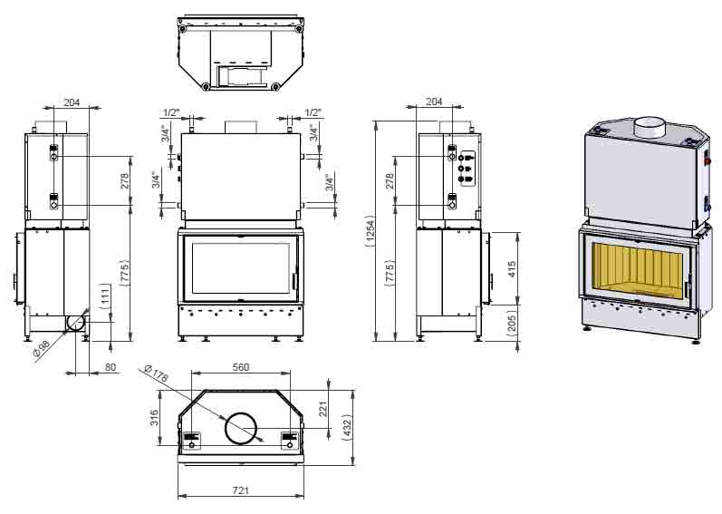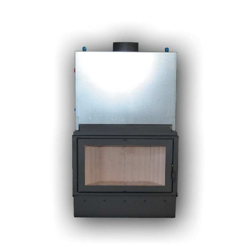 Teplovodní krbová vložka s topeništěm z litého žárobetonu, dvířka s rovným prosklením, teplovodním výměníkem s vychlazovací smyčkou.