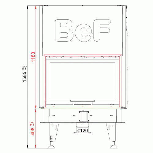 Průhledová krbová vložka, jedny dveře prosklené a výsuvné nahoru, druhé plné a otevíravé do strany.