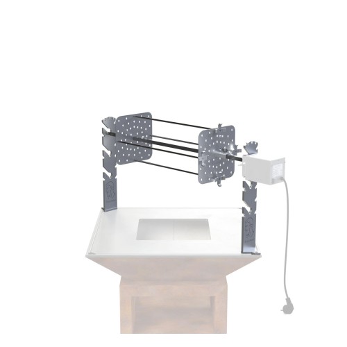 Nekompromisní výkon motoru (příslušenství) je 40 kg. Veškeré části Rotisserie jsou vyrobené z masivní nerezové oceli, pro maximální životnost, tak jak jste u produktů Vulcanus zvyklí. Masivní nosné nohy jsou z 10 × 80 mm silné nerezové oceli a hlavní Rotisserie je vyrobená z plného nerezového čtyřhranu 16 × 16 mm. Sestava je doplněna dvěma přítlačnými talíři s více než padesáti polohami a čtyřmi jehlami, pro maximální variabilitu zajištění surovin. Standardně je sestava vybavena klikou, kterou můžete aretovat v šesti polohách, nebo ji během vteřiny nahradit za motor (příslušenství). Hlavní nohy Rotisserie mají připravené polohy pro doplnění o grilovací systém ASADO, nebo držadla jehly pro ořezávání masa.
