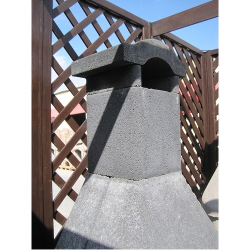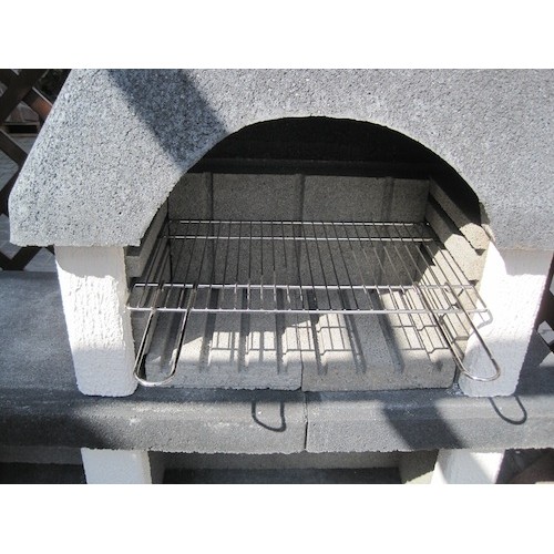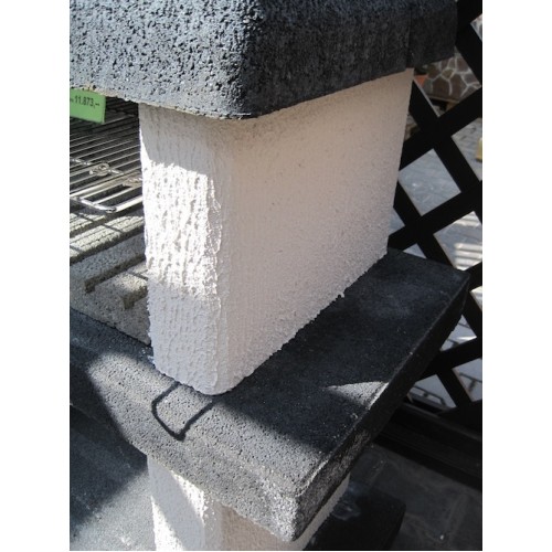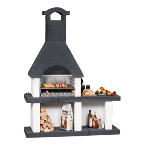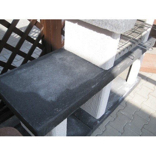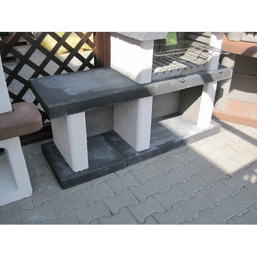 Praktický zahradní krb s odkládací plochou, dodávaný jako stavebnice v provedení bez povrchové úpravy (betonově šedá barva) s černě probarvenou střechou, základovoudeskou a pracovní deskou. Výškově stavitelný chromovaný grilovací rošt, dvoudílná deska ohniště.